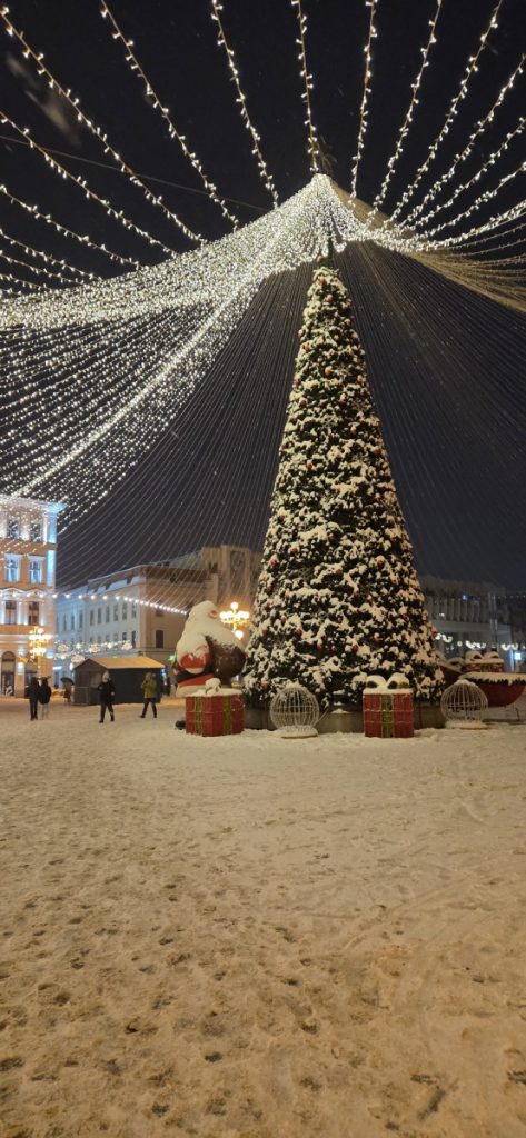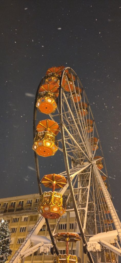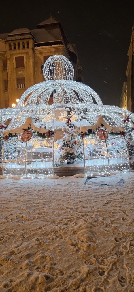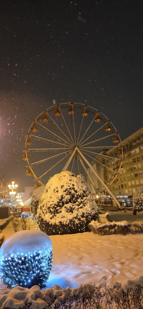 În ziua concertului a nins. Iar drumul spre Operă mi-a dărut stop-cadre din altă lume. Pe fundalul ultimelor frânturi alte târgului de Crăciun, zăpada se așternea molcom. Peste roata panoramică. Peste Fântana cu Pești. Iar ultimile lumini din sezon se refractau în fulgi.