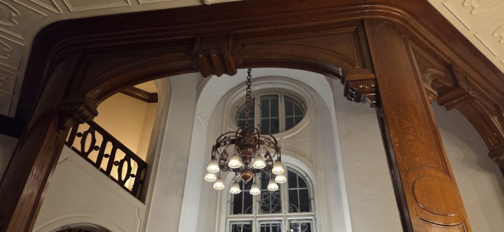 Senzația aceea de ireal doar s-a amplificat în momentul în care am intrat. Spațiul este renovat, dar este făcut cu discreție. Noul pune în valoare vechiul, îl ajută să strălucească. Lumini atent alese, imitând sfeșnice cu lumânări. Un candelabru superb. O scară clar reabilitată, dar cu extrem de mult bun gust. Toate aceste elemente îmbrățișează parcă ”tabloul” principal: o fereastră imensă, cu două fotolii. Visul oricărui cititor.