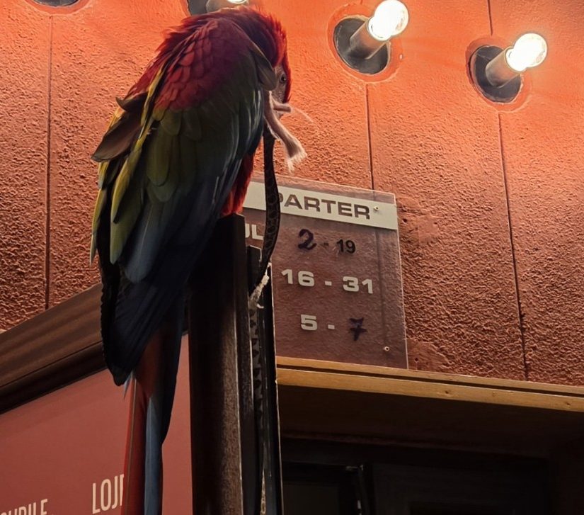 Iată un cuvânt pe care nu credeam că o să-l scriu vreodată altfel decât metaforic. În general, papagaii cu care interacționez au două picioare. Așa că imaginați-vă perplexitatea mea, când, la intrarea în filarmonică, mă trezesc privită de … well, un ochi. Nu știu ce căuta papagalul la filarmonică. Aș fi curioasă să știu dacă a plătit bilet și dacă a apreciat concertul. Sau dacă a venit doar pentru admirația publicului. Așa sau așa, Mr. Le Papagal a avut propriul său moment de glorie și a încântat publicul și la intrare și la ieșire. Iar acum a aterizat și pe blogul meu. Cu plăcere. Zău, chiar a fost o plăcere.