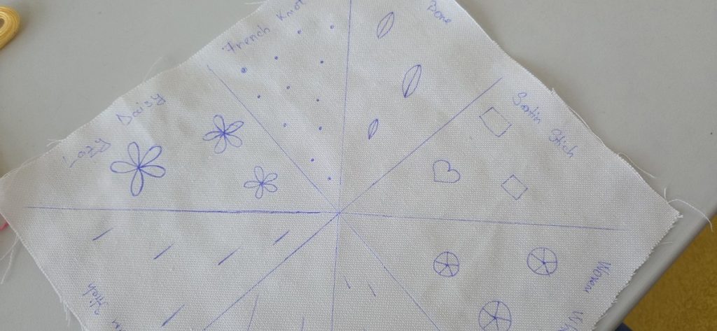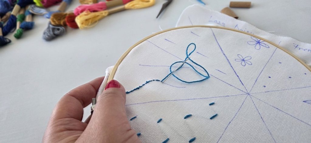 Atelierul de brodat la care m-am nimerit s-a dovedit a fi ”a two people affair”. Bine pentru mine, nu așa de bine pentru ei. Ca participant, am beneficiat de îndrumări 1:1 și de toată atenția Eugeniei, organizatoarea. Am început cu un stil de cusătură simplu, în linie. Am avansat ușor. La finalul celor două ore știam să brodez în linie, în lanț și să fac petale.