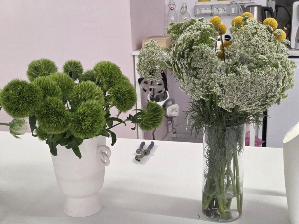 Cu informația ”la purtător”, ne-am apucat noi de treabă. Gruni a pus la dispoziție vasele de ceramică și un kenzan pentru fiecare participant. Patricia a venit cu florile. Le-a ales în așa mod încât să se poată combina ușor între ele. Cu ocazia asta, am descoperit și m-am îndrăgostit de un nou tip de garoafă – verde, pufoasă și doar vag înrudită cu florile pe care le găsim în comerț.