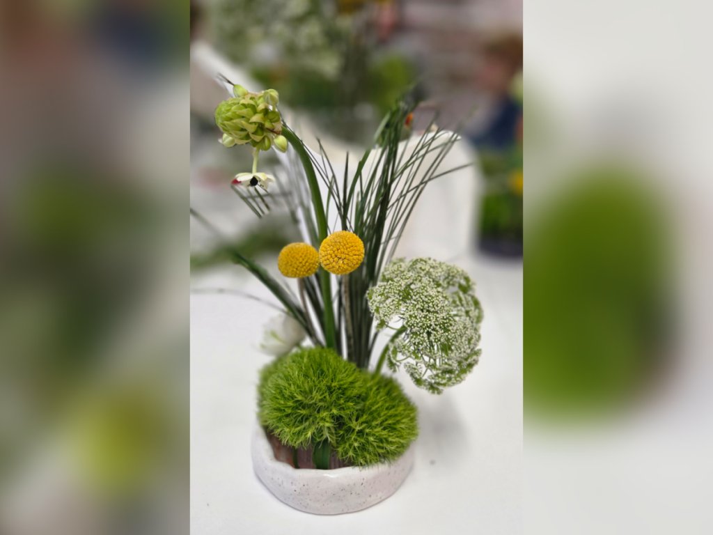 Surpriza a venit la câteva zile după altelier. Planta centrală aleasă de mine a fost o Ornithogalum, verde încă. Iar într-o dimineață, la vreo două zile distanță, m-am trezit cu ea înflorită. Brusc, tot vibe-ul aranjamentului s-a modificat. Poate că Ikebana este și o lecție despre răbdare.